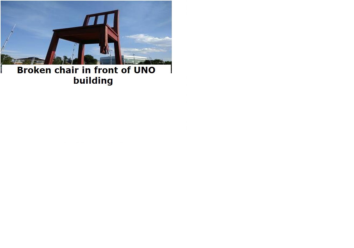In front of the building is a big broken chair and close to the chair are the fountains. The iconic image is a reminder to the nations to remember the condition of landmine victims and to commit themselves to eradicate cluster munitions. This memorial to the people who lost their body parts in landmine is 39 feet high and made of wood.